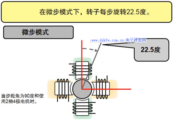 半步模式是以电机固有的结构决定的步距角的一半角度进行步进旋转。如下图所示,步进电机的总极数是4级,对应的步距角是90度,那么半步模式下,步进电机每个脉冲旋转45度。