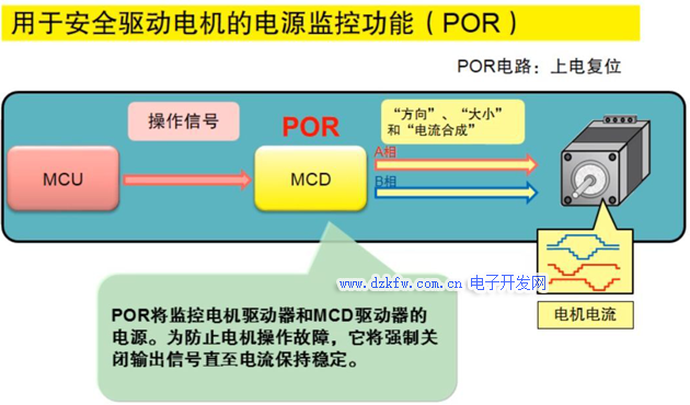 上电复位功能将监控电机驱动器,以及电机驱动控制器的电源。为防止电机操作故障,它将强制关闭输出信号直至供电电压保持稳定。如下图所示。