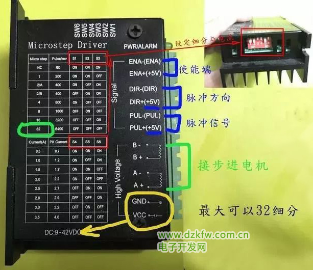 3、细分:实际应用中发现,步距角很大的话,每次转动的角度也就很大,会引起振动,相应的控制误差也会变大。所以引入了细分的功能。意思就是,通过驱动器的DIP开关把步距角多分几分,让电机转动更加平稳。