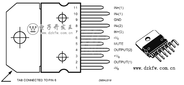 1.电源负极 2.输出1 3.正极 4.输出2 5.静音控制 6.电源负极 7.正向输入2 8.负向输入2 9.底线 10.负向输入1 11.正向输入1