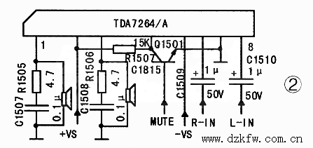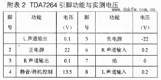 TDA7264是飞利浦公司推出的一款MULTIWATT8脚封装、BTL型输出的双声道音频功放。是专为Hi-Fi音乐设备、高质量电视机而设计,功放块输出级采用DMOs型场效应管与双极型晶体管混合搭配。使Ic具有电压供电范围宽(±10v~±25V或10V-50V)、输出功率大(在VS=±20V、THD=10%、RL=8Ω时,PO=2×25W)、噪音低、线性好、失真低,耐压高、音色优美且自身损耗低(典型值±20V供电情况下的静态电流仅20mA)等特点。除此以外,该块还具有开/关机静音(避免了开关机时扬声器发出的“噗”“噗’’声)、过热(140℃)保护、短路保护、待机控制(当④脚电压低于1.4V时.工作于待机模式,内部电路停止工作,以减小能耗)、静音控制(当④脚电压低于1.5V时,工作于静音模式,关断信号通道)、外围元件少等优点。是高级音响、车载音响、高音频质量电视机常用的音频放大IC。附图2是它存TcL王牌TcL-HiD432型背投彩电上的应用电路,附表2是它的引脚功能及在该彩电上的实测直流电压值。