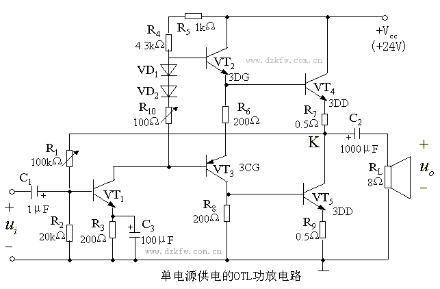 图1电路为单电源OTL功放电路。它与OCL功放的区别仅在于输出端接有1000μF的大电容C2。就该电路的直流通路来说,只要VT4、VT5两管特性相同,K点电位便为VCC/2,因为C2上直流电压可被充电到VCC/2;就交流通路来说,C2可视为短路,只要时间常数RLC2选得比正弦输入信号的最大周期大得多,那么用C2和单电源+VCC,就可代替双电源±VCC的作用。因此图1是一个OTL电路。