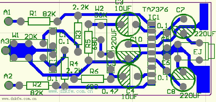 说明:电路原理图中,W1为双联电位器,用于低音增强,W2为调节混响效果。印刷电路板图中,A1,A2为左右声道输入。电位器W1和W2都固定在盒子的边缘,其中W2为带开关的电位器。