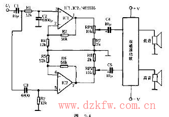 采用有源分频器可以降低对功放带宽的要求;省去了大功率的LC元件;分频点也易于调整,且可以获得比功率分频更佳的效果。这里介绍两种有源二分频器电路。如图9-4所示为有源二分频器组成的功放电路。IC1、R1、R4、R3、C2组成一阶低通滤波器,以便从输入信号C1中分离出小于截止频率FOL的音频信号。