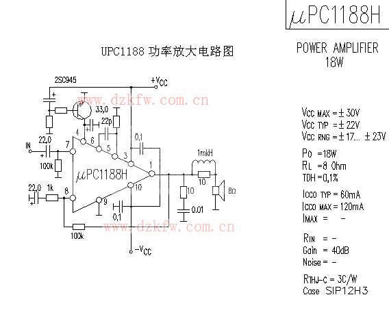 UPC1188功率放大芯片,±22V工作电压,输出功率可达18W。UPC1188 POWER AMPLIFER