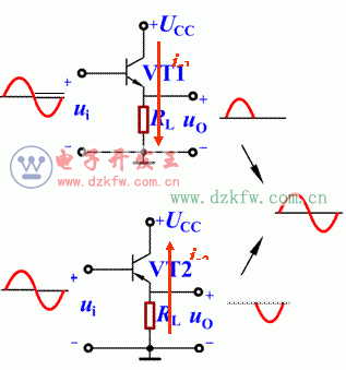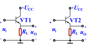 在 ui 负半周, VT2 发射结正偏导通, VT1 截止。