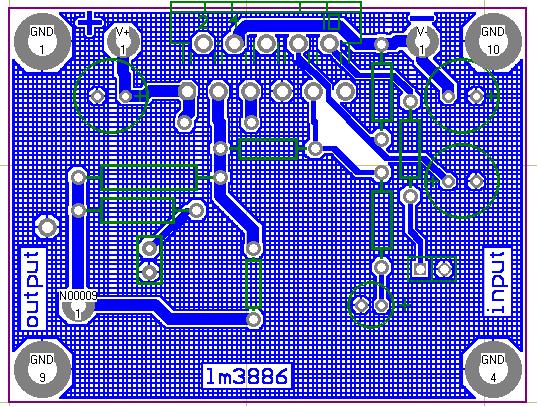 下面是我排版的PCB图,单面板,自己动手加工很容易的。因为只是纯后级,电位器就取消了;静音常开,开关也取消了;在输出端加入了3Ω/2W的电阻和0.1PF的喇叭补偿电路。下面左图为PCB走线图,右图为元件排列图,马上抓下来照作,然后告诉我效果如何?千万不要告诉我不响哦 : )