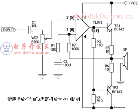 图中的运算放大器IC1於同相输入放大器,将输入信号从可变电位器VR1的滑动触头连至其同名端(+)。电阻R3和R4有两个功能:第一功能前面已经说过,就是强制运算放大器工作在甲类状态;第二个功能是為TR1和TR2所组成的输出级提供偏压。