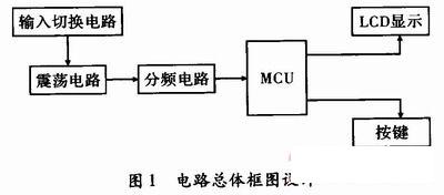 如图1所示。框图包括输入切换部分、振荡部分、分频部分、单片机部分、显示部分和键盘部分。此系统由STC89C51单片机作为控制核心,输入切换部分采用双刀双掷继电器完成待测电容或电感的线路切换,振荡电路工作在放大谐振状态,频率有高频管9018的集电极输出,由于频率较高,所以需经过信号分频,再者由于输出的电压幅度大,此处无需再加一级驱动,以74LS393数字分频芯片,把分频端级联实现100分频,最终信号进入单片机,由单片机计算出频率,经过算法设计,实现未知电容或电感参数的测定。图1给出了系统的总体框架图。