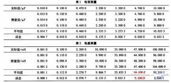 电路的固定参数如下:Rb1=10 kΩ,Rb2=10 kΩ,Rc=4 kΩ,Re=4.7 kΩ,Cb=1μF,Ce=0.1μF,选择不同的电容分别测试3次,得到表1。选择不同的电感分别测试3次,得到表2。由表得出测量值与标称值几乎接近,表明系统设计方案的正确性,满足一般的实验室和工程设计用到的电子元器件参数测试精度要求。