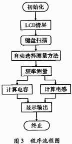 系统上电初始化并且清屏,单片机初始化完成后,进入键盘扫描程序,当要进行电容或电感测量时,选择测量按键,系统进行自动判断并进行电容或电感的测量。当判断为电容时,系统选择电容的计算方法。当判断为电感时,系统选择电感的计算方法。计算完成后在液晶屏上显示测量结果。下面是具体的程序流程图,如图3所示。