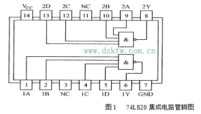(1) 用集成电路74LS00和74LS20(74LS20管脚见图1所示),按图2连接电路(自己设计接线脚标),A、B接输入逻辑,F接输出逻辑显示,检查无误,然后开启电源。
