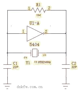其中,Y1是晶体,相当于三点式里面的电感;C1和C2是电容,而5404和R1则实现了一个NPN型三极管(大家可以对照高频书里的三点式电容振荡电路)。