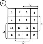 图1所示的卡诺图可以简化成如图2所示。在图2中,用0、1分别表示反变量和原变量,变量ABCD的每种取值组合,与方格内的最小项一一对应,例如,0000对应于 ,1111对应于ABCD,余类推。这样,只要标出方格外纵、横两向的二元常量,即可由二进制码推出相应的最小项的十进制编号。