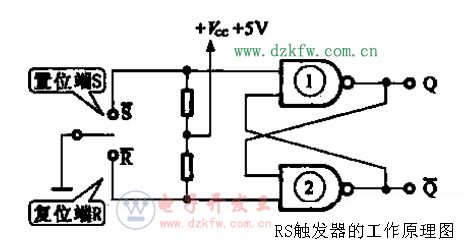 所示是表示RS触发器的工作原理图,当开关既不在S端,也不在R端时,触发器的输出端