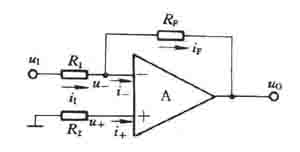 在上图中,输入电压u1经电阻R1加到集成支放的反相输入端,其同相输入端经电阻R2接地。输出电压u0经RF接回到反相输入端。集成运放的反相输入端和同相输入端,实际上是运放内部输入级两个差分对管的基极。为使差动放大电路的参数保持对称,应使两个差分对管基极对地的电阻尽量一致,以免静态基流流过这两个电阻时,在运放输入端产生附加的偏差电压。因此,通常选择R2的阻值为
