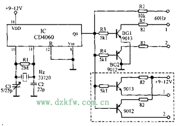 数字钟标准60HZ时基电路如下图所示,CD4060是14位二进制串行计数器/振荡分频器。振荡器与外接晶体有R1、C1、C2构成30720Hz振荡电路;另一部分为14级分频器。用前9级分频器,其分频数为512。振荡器的输出经分频后得到标准的60Hz信号从Q9输出,作为数字钟电路的标准时基信号。BG1、BG2构成60Hz信号同步开关,在60Hz信号的作用下,BG1、BG2交替导通,BG1集电极和BG2的发射极分别接双阴型显示屏的阴1和阴2脚上,保证了双阴型动态显示屏的正常工作。这部分电路适用于LM8560、TMS3450等一类数字钟集成电路。若时基电路用于MM5456等一类数字钟集成电路,由于其配套为双阳极型显示屏,可以把信号同步开关电路改为虚线框内的形式。若时基电路用于LM8361、MHZ7317等一类的数字集成电路,由于其配套为单阴型显示屏,所以其信号同步开关可以省略。