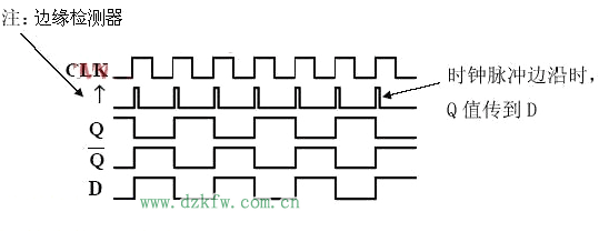 每当输入一个时钟信号,Q就被置为D的原有值,同时Q值改变(D也是如此)。而D改变时,脉冲边沿也就过去了。