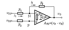 集成运放的Avd和Rid为有限值时,对运算电路将引起误差,现以图1所示的运算放大电路为例来讨论,用图2电路来等效,