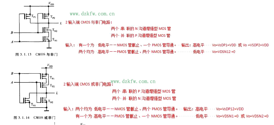 N个输入端必须有n个NMOS管串(并)联、n个PMOS管并(串)联。当输入端的数目越多,则串联的管子也越多。