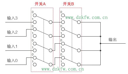 如果用开关说明多路复用器的工作原理,如图5所示。开关A包括4个纵向联动开关。开关B也是一样。那么,当开关A为0,开关B也为0时,可以看到输入0连接到输出上,也就是输入0的信号被输出。同样,当开关A为1,开关B为0时,输入1的信号将连接到输出上。当开关A为0,开关B为1时,输出2的信号将连接到输出上。当开关A为1,开关B为1时,输入3的信号将连接到输出上。也就是说,可以通过开关A和开关B从4个输入中选择一个输出。这就是实现信号切换的多路复用器电路。