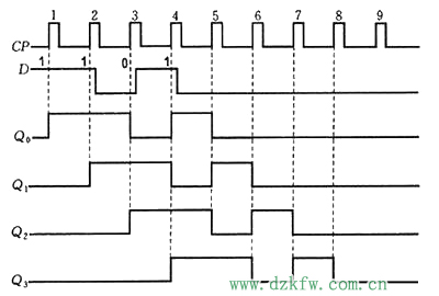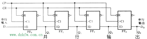 图1 用边沿D触发器构成的4位移位寄存器