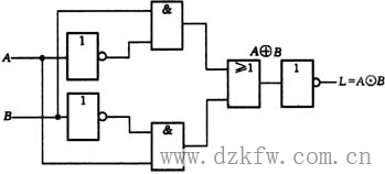 上式表明同或函数的反函数为异或函数,它表明两个输入变量取值不同(一个为0,另一个为1)时.输出函数值为1。上面的推导更明确地告诉我们,异或门和同或门互为非函数。所以在异或门电路的输出端再加一级反相器,也能得到同或门,如图2所示。