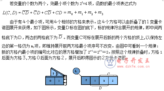 按照同样的方法,可从折叠的2变量卡诺图展开获得3变量卡诺图。3变量逻辑函数L(B,C,D)应有8个最小项,可用8个相邻的方格来表示。新增加的4个方格按展开方向应标以新增加的变量B(以区别于原来的变量C、D)。而且,新增加的方格内最小项的编号为展开前对应方格编号加2n-1=23-1=4,这样即可获得3变量卡诺图如下: