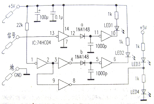 本次制作的逻辑检测器的设计目标是在高、低电平检测的基础上增加正、负脉冲的检测功能。检测器电路见图1。整个电路采用了一只六反相器74HC04及四只发光二极管。