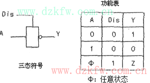 数字电路三态输出功能的逻辑表示符号及功能表如下图所示。图中电路输出端到底处于何种状态,需要一个专门的输入端来控制,该输入端“Dis”称之为“禁止输入端”。对于正逻辑系统,当禁止输入端为逻辑高电平时,电路输出端呈现高阻状态.电路的逻辑功能传递过程被禁止,各个输入状态对输出端的影响全部消失。当禁止输入端“Dis”处于逻辑低电平时,表示该禁止作用被解除,电路恢复到具有两状态的正常逻辑功能,如下图功能表所示。