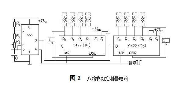 工作时,先用负脉冲清零,使寄存器输出全部为0,然后在节拍脉冲(可由555定时器构成的多谐振荡器输出)的控制下,寄存器的各个输出Q按下表所示的状态变化,每8个节拍重复一次。这里假定8路彩灯的花型是:由中间向两边对称地逐次点亮,全亮后,再由中间向两边逐次熄灭。