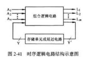 在数字电路中,凡是任一时刻的稳定输出不仅决定于该时刻的输入,而且还和电路原来状态有关者都叫时序逻辑电路。时序逻辑电路结构示意图如图2-41所示。时序逻辑电路的状态是靠具有存储功能的触发器所组成的存储电路来记忆和表征的。