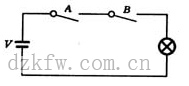 图1(a)表示一个简单与逻辑的电路,电压V通过开关A和B向灯泡L供电,只有A和B同时接通时,灯泡L才亮。A和B中只要有一个不接通或二者均不接通时,则灯泡L不亮,其真值表如图1(b)。因此,从这个电路可总结与运算逻辑关系。