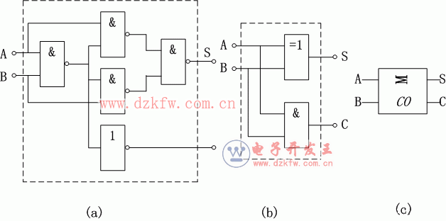 由逻辑式就可画出逻辑图,如下图(a)和(b)所示,由一个“异或“门和一个”与“门组成。半加器是一种组合逻辑电路,其图形符号如下图(c)所示。