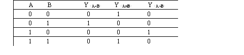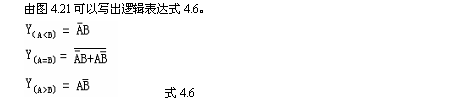 图4.21是1位数值比较器的逻辑图。它有两个输入端,分别输入数值A和数值B。两个数值进行比较时有三种结果:A>B、A=B以及A<B。所以它有三个输出端。
