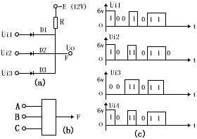 | 图二为三端正或门电路,只要有一个输入端为“1”信号。输出端就为“1”信号,称为或门。图(b)是波形图,它们的逻辑表达式为:F=A+B+C |