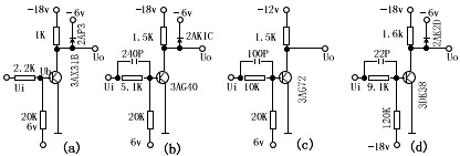 | 图三为非门电路,它的逻辑功能是:输入为:“0”,输出为“1”,反之则反,由于ui与uo反相,所以又称反相器,其逻辑符号如图(b)所示, 图中C1为加速电容,D1为箝位二极管,D2超抗饱和作用,原理是:当BG饱和时,ud>uc(通常ub为(0.7-0.8)伏,uc为(0.1-0.3)伏),使D2导通,若D2压降为0.2伏,ub=-0.7伏,此时uc变为0.5伏,这就减轻了饱和深度,另外由于ID流入BG,就使Ic增加,Ib减小,通过Ib自动调节作用,使电路能稳定地工作。 图四为非饱和式反相器,图五为几种常用反相器,它们的技术指标列于表一中 |