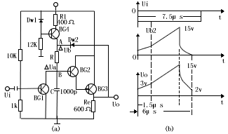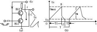 | 图1是(a)是恒流源锯齿波电路,BG1是开关管,由输入矩形脉冲控制其饱和与截止,BG2是共基恒流管,因此,当BG1截止时,BG2以恒定电流i对C充电,电压uc线性地增长;当BG1饱和时,C通过BG1快速地放电,从而产生锯齿波如图1(b)示。 |