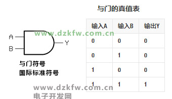 与门是实现逻辑“乘”运算的电路,有两个以上输入端,一个输出端(一般电路都只有一个输出端,ECL电路则有二个输出端)。只有当所有输入端都是高电平(逻辑“1”)时,该电路输出才是高电平(逻辑“1”),否则输出为低电平(逻辑“0”)。 其二输入与门的数学逻辑表达式:Y = AB,对应的真值表如下:
