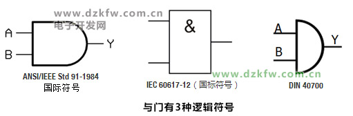 与门有3种逻辑符号,包括:形状特征型符号(ANSI/IEEEStd 91-1984)、IEC矩形国标符号(IEC 60617-12)、DIN符号(DIN 40700)。