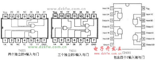 与门是基本的逻辑门,因此在TTL和CMOS集成电路中都是可以使用的。标准的74系列CMOS集成电路有74X08、74X09(OC),包含四个独立的2输入与门;74X11,包含三个独立的3输入与门;74X21,包含两个独立的4输入与门。CD4000系列集成电路有:CD4081,包含四个2输入端与门;CD4082,包含两个4输入端与门。 引脚分配如下: