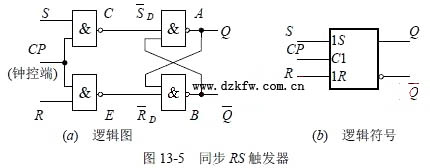 由与非门构成的同步RS触发器如图13-5(a)所示,其逻辑符号如图13-5(b)所示。图中门A和B构成基本触发器,门C和E构成触发引导电路。