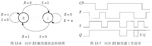 图13-7是同步RS触发器的工作波形。当CP=0时,不论R、S如何变化,触发器状态维持不变。只有当CP=1时,R、S的变化才能引起状态的改变。