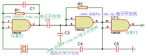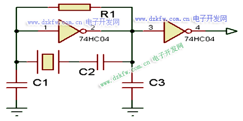 晶振基频频率一般于1.8~25MHz,工作于基频的晶振一般与数字门电路组成振荡器,电路比较简单: