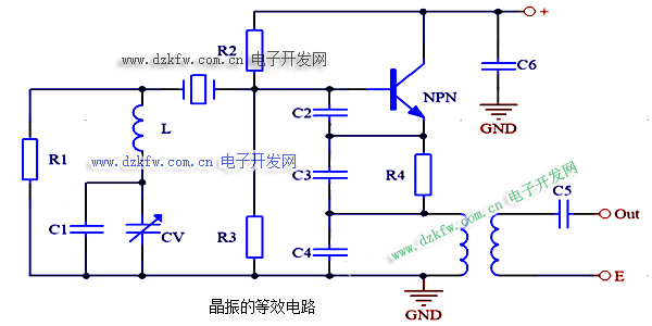 晶振五次泛音频率一般在80~150MHz范围,频率更高,工作于五次泛音的电路常使用共基极的晶体管振荡器: