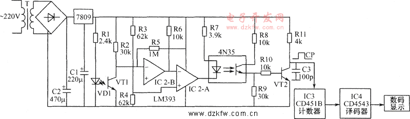 当有物体通过红外发光二极管VD1和接收管VT1之间,红外线被挡住,VT1截止,IC2-A的1脚输出高电平,4N35截止,VT2截止,VT2集电极输出高电平,故当有物体通过VT1时,便在VT2集电极上输出计数脉冲信号,该信号送到十进制计数器,再送到译码显示电路,显示出相应的数据。