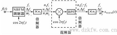 使用倍频器提高了调频指数,但也提高了载波频率,这有可能使载波频率过高而不符合要求。为了解决这一矛盾,往往在使用倍频器的同时使用混频器,用来控制载波的频率。