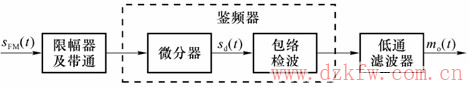 鉴频器的构成:由一个微分器和一个包络检波器级联而成。微分器将一个调频信号变为调幅调频信号,然后包络检波器从复合调制的调幅调频信号的幅度中,将原始信号信息提出。