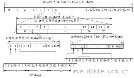 5)超高帧等于2048个超帧,超高帧的周期与加密和跳频有关。每经过一个超高帧周期,循环长度为2715648,相当于3小时28分53秒760毫秒,系统将重新启动密码和跳频算法。