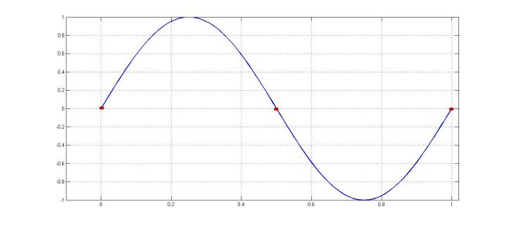 假设一条正弦曲线为sin(2π/t),频率为1Hz。我们以2Hz的频率对该曲线进行采样(每隔0.5s),可以得到3个红色采样数据,如下图: